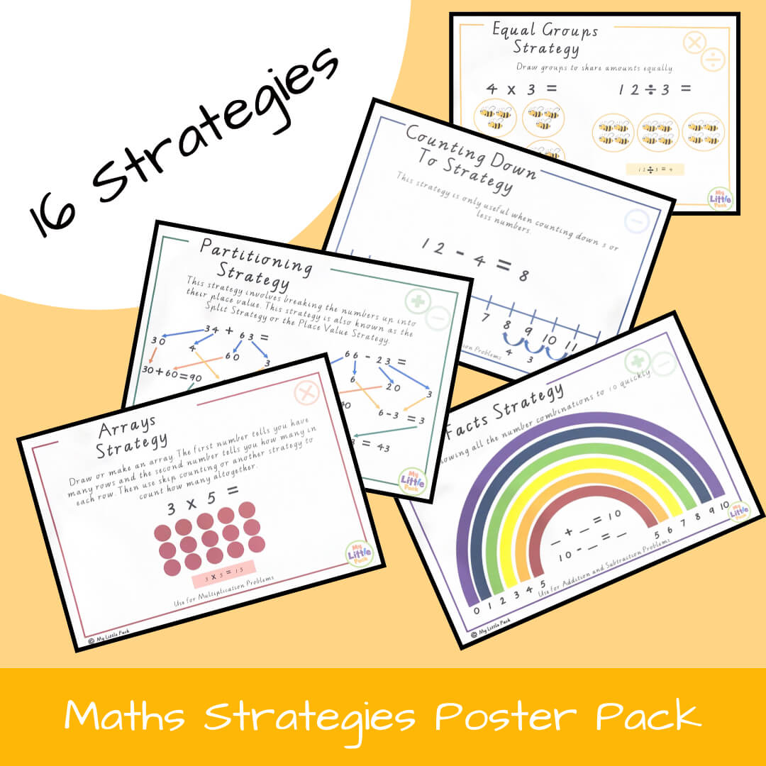 This pack includes 16 informative and easy to follow addition, subtraction, multiplication and division posters. No matter what year your child is in, there will be a strategy poster to assist them with solving number problems.